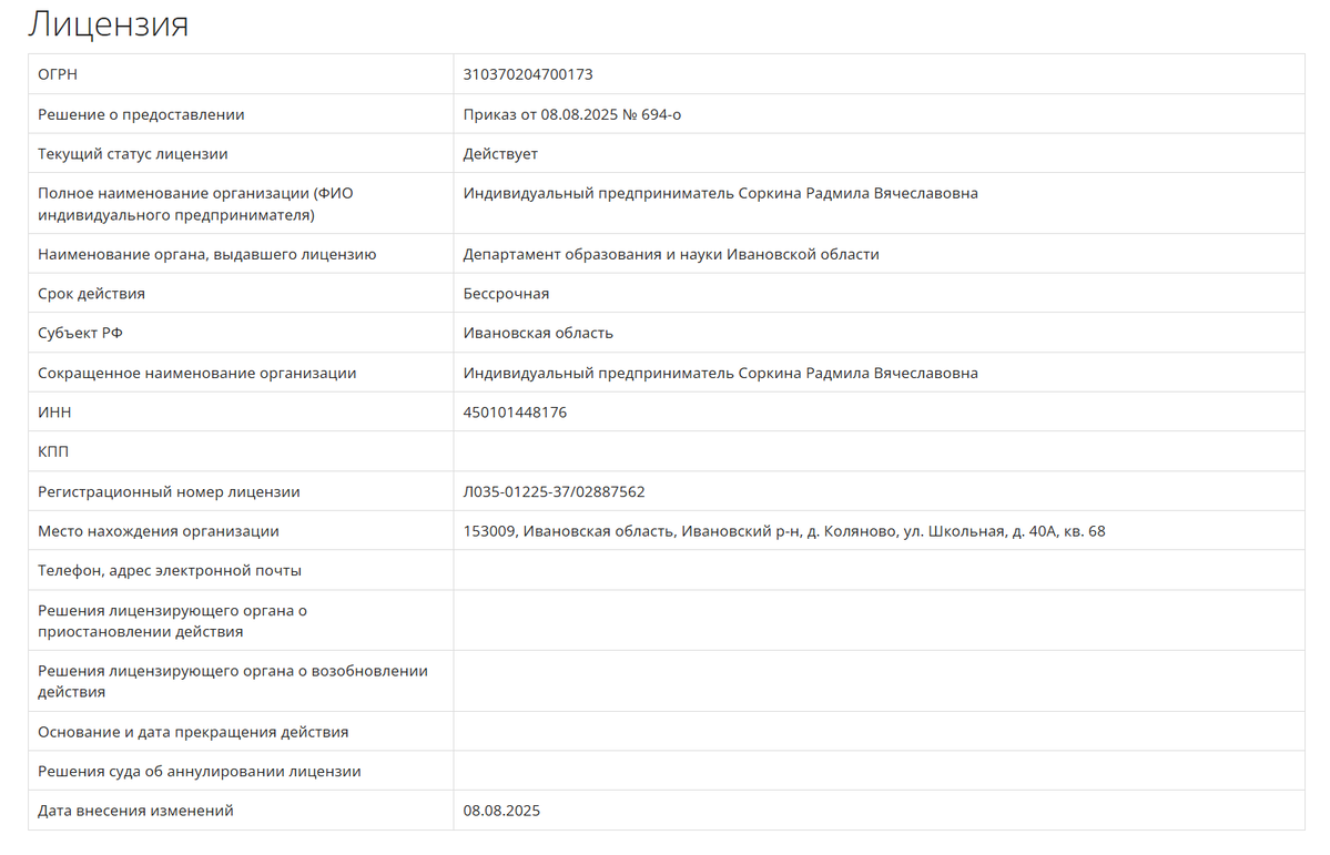 Выписка из реестра лицензий ИП Соркиной Р.В. №Л035-01225-37/02887562